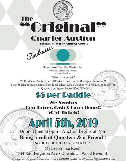 The “Original” Quarter Auction is back! On Friday, April 5, 2019, doors open at 6:00pm, auction begins at 7:00pm. It’ll take place at Madison’s Tea Room; 144 East Ferguson Ave, Downtown Wood River. Bring a roll of quarters and a friend. New & discontinued items from local direct sales vendors will be auctioned off for 1-4 quarters per item.